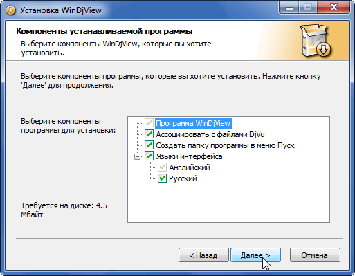 Надо скачать программу для чтения djvu — архив с файлами. Для установки приложения следует открыть архив и запустить установочный файл. Программа устанавливается на компьютер стандартно. Пользователь выбирает язык, в котором будет работать приложение. Как и другое бесплатное ПО, WinDjView имеет некоторые дополнения, если в них нет необходимости, надо снять соответствующие галочки в окне установки. Чтобы начать установку, согласитесь с условиями использования, далее начнётся инсталляция. Она занимает всего несколько секунд, после чего ПО готово к работе.